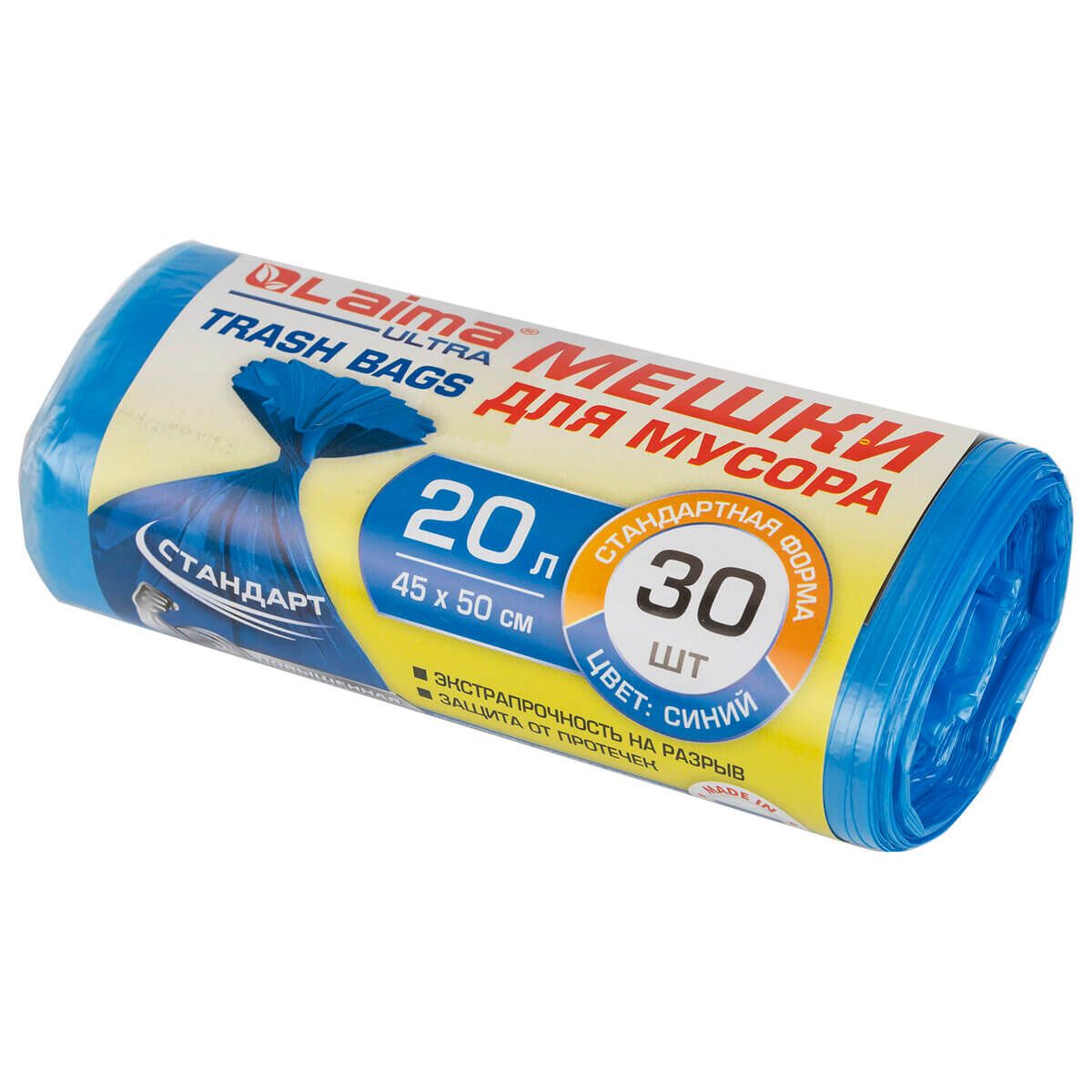 Мешки для мусора 20 л, синие, в рулоне 30 шт., ПНД, 8 мкм, 500х450 мм, LAIMA, 607682
